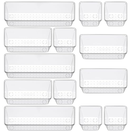 12 Piece Clear Drawer Organizer Set, 3 Sizes Bathroom Vanity Organizer Trays and Storage Bins for Makeup, Cosmetics, Jewelry, and Gadgets. Perfect for Office, Kitchen, Bedroom, Bathroom Use.