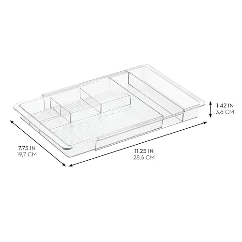 Make the most of your storage space with the iDesign Clarity Collection Expandable Drawer Organizer Bin. Extend the vanity makeup organizer to 18.5” long, ensuring the perfect fit in any drawer. It’s a sleek cosmetic organizer with multiple different-sized compartments to store your makeup brushes, palettes, lipsticks, eyeliner, contact lenses, medication, and other bathroom items. Ideal for storing items on or in your counter, vanity, dresser, nightstand, or desk. The organizer has clean lines and transparent plastic construction, making it easy to see all your belongings. Made of durable clear plastic construction, it is made to last. When not extended, the bathroom drawer organizer measures 11.25” x 7.75” x 1.25” to fit in any space. With iDesign, you can live simply every day.