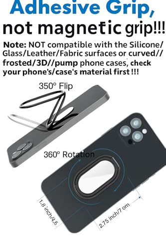 Item dimension: 2.75in *1.8in (7cm*4.5cm). Kind reminder: As a versatile phone stand that combines a phone stand, phone grip, and phone holder—featuring foldability, rotatability, and multi-angle adjustment—it may be slightly larger than that of a single-function phone grip. Note: NOT compatible with the Silicone/Glass/Leather/Fabric surfaces, may also NOT compatible with curved/frosted/3D/pump phone cases, check your phone’s/case’s material first!!!